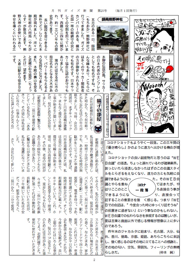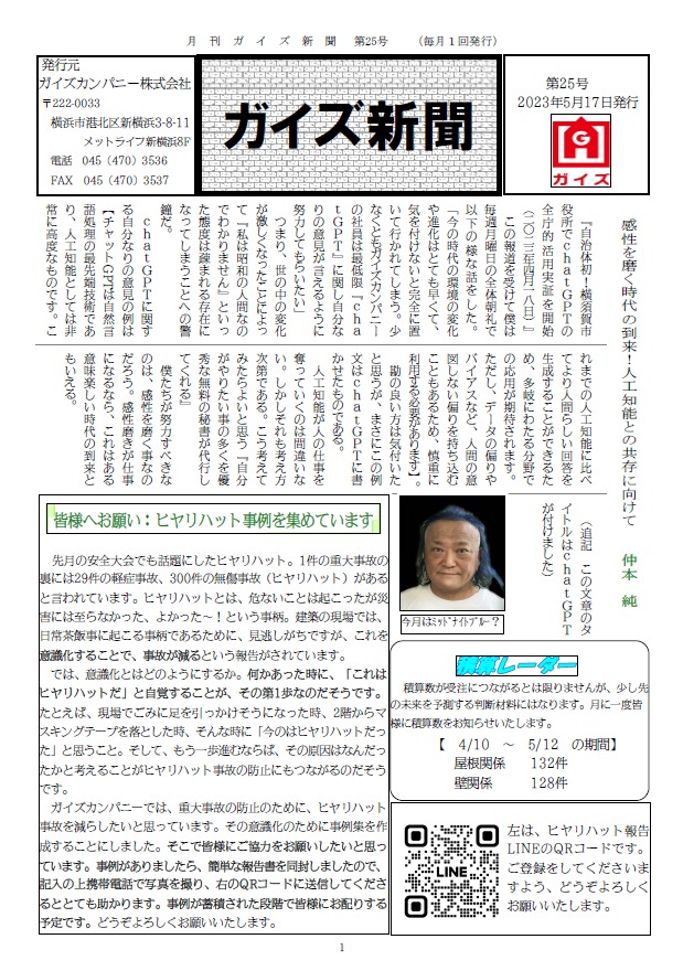 event ガイズ新聞発行【第25号】 ガイズ新聞発行しました📰🎏 今月号は、人口知能について・ヒヤリハット報告について・師岡熊野神社の紹介・コロナについて・靖子の部屋など…! ぜひご覧ください😉 Application イベントへのお申し込みはこちらから 必須イベント名 例: 完成見学会 必須参加希望日 例:2021/04/01 10:00 必須参加人数 例:2名 必須お名前 例:山田 太郎 必須メールアドレス 例:t_yamada@sample.jp 任意郵便番号 住所検索 例:123-4567 必須住所 例:神奈川県横浜市 任意電話番号 例: 045-000-0000 任意お問い合わせ内容 例:○○○イベントの詳細を知りたい。 ※当社が保有する個人情報に関して適用される個人情報保護法およびその他の法令・規範を遵守いたします。内容をご確認の上、よろしければ上記の「入力内容を確認する」ボタンを押して下さい。 ※このサイトはreCAPTCHAを利用しており、下記内容の他、Googleプライバシーポリシーおよび利用規約が適用されます。 個人情報利用目的 ・お客様のご要望に合わせたサービスを提供させていただくための各種ご連絡。・お問い合わせいただいたご質問への回答のご連絡。尚、お客様から収集する個人情報は弊社の定めるプライバシーポリシーに則って厳重に管理いたします。 プライバシーポリシー ガイズカンパニー株式会社では、ガイズカンパニーホームページ(以下、「当サイト」といいます。)の運営に際し、お客様のプライバシーを尊重し個人情報に対して十分な配慮を行うと共に大切に保護し、適正な管理を行うことに努めております。 1.個人情報利用目的 お客様の個人情報は、原則として、当社のサービスに関する情報をご提供する目的や当社に対するご意見、ご要望に関する今後の改善、及び、問い合せに関するご回答のために利用致します。それ以外の目的で利用する場合は個人情報をご提供いただく際に予め目的を明示しておりますのでご確認下さい。 2.第三者への情報提供 お客様の個人情報は、以下の場合を除き第三者に開示、提供、譲渡、することは致しません。1.法的拘束力がある第三者機関からの開示要求がある場合2.協力業者と提携して業務を行う場合(協力業者にも適切な管理を行います)3.お客様本人の同意があった場合 3.開示等の請求等 お客様等が個人情報の利用目的の通知、個人情報の開示、訂正、追加若しくは削除を希望される場合は、希望される方が本人であることを確認の上速やかにこれに対応いたします。 4.安全管理 個人情報保護に関して適用される法令、規範を遵守するとともに正確かつ最新の内容に保ち安全管理のための必要かつ適切な措置を行います。 5.従業員の監督 弊社では、お客様等の個人情報の安全管理が図られるよう従業者に対する必要かつ適切な監督を致します。また、従業者に対して個人情報の適正な取り扱いの確保のために必要な教育を実施します。 6.クッキー(Cookie)の利用 当サイトではクッキー(Cookie)を利用しております。クッキー(Cookie)を使用する目的はお客様が当サイトを再訪された際に便利にお使い頂くことを目的に使用しており、お客様のプライバシーを侵害するものではありません。 7.適用範囲 本プライバシーポリシーは当サイト内にのみ適用されます。当サイトからリンクの張られている他のサイトでの個人情報保護についてはリンク先のプライバシーポリシーによって行われます。 8.漏えい発生時の対応 お客様等の個人情報の漏えい等が発生した場合には、事実関係を速やかにお客様等に通知するなど、迅速かつ適切に対応します。 9.継続的改善 弊社では、個人情報保護に関する内部規定の整備、従業者教育及び内部監査の実施などを通じて、社内における個人情報の取り扱いについて継続的な改善に努めます。 前の記事 次の記事 一覧へ戻る
